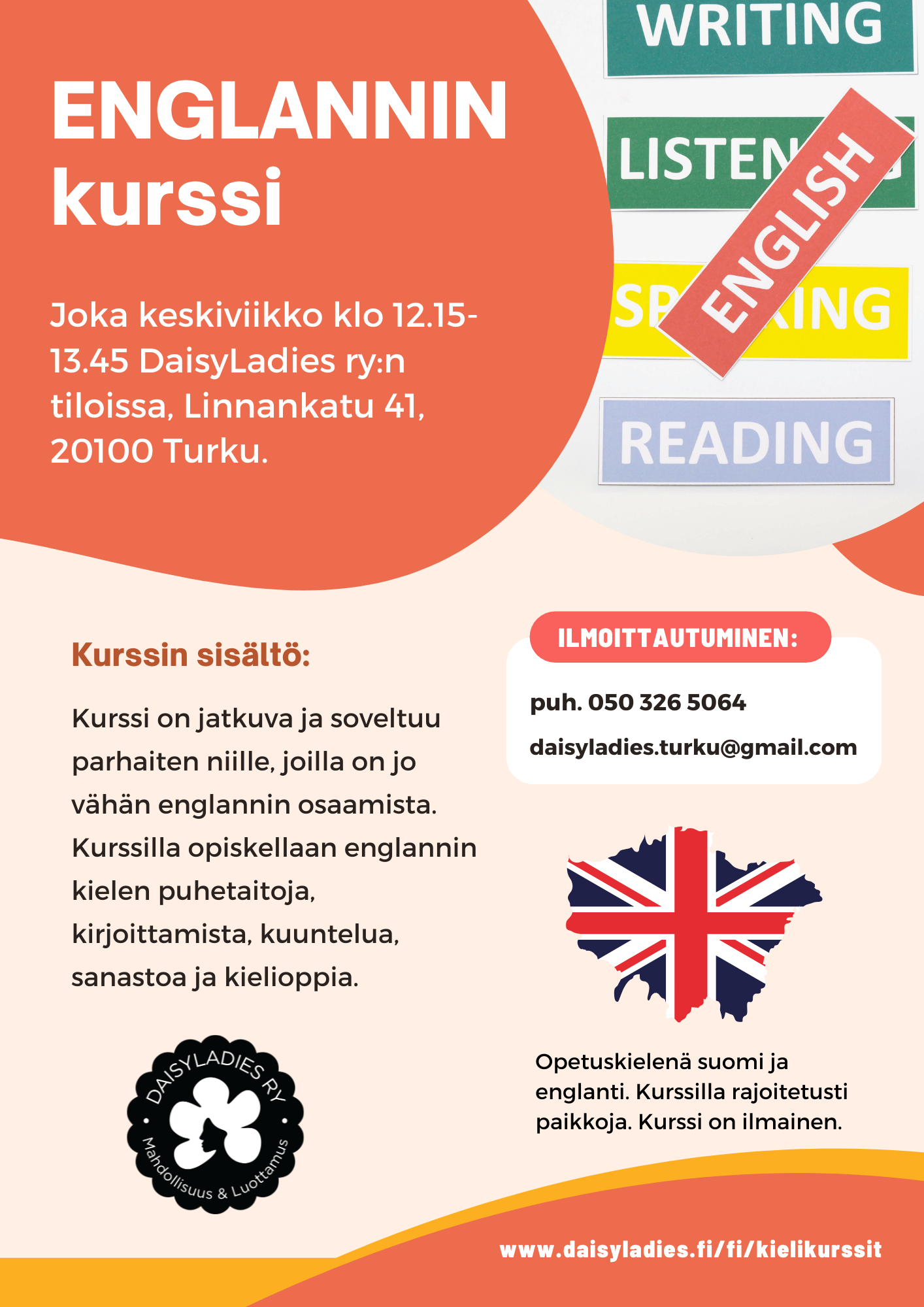 Joka keskiviikko klo 12.15-13.45 DaisyLadies ry:n tiloissa, Linnankatu 41, 20100 Turku. Kurssi on jatkuva ja soveltuu parhaiten niille, joilla on jo vähän englannin osaamista. Kurssilla opiskellaan englannin kielen puhumista, kirjoittamista, sanastoa ja kielioppia.