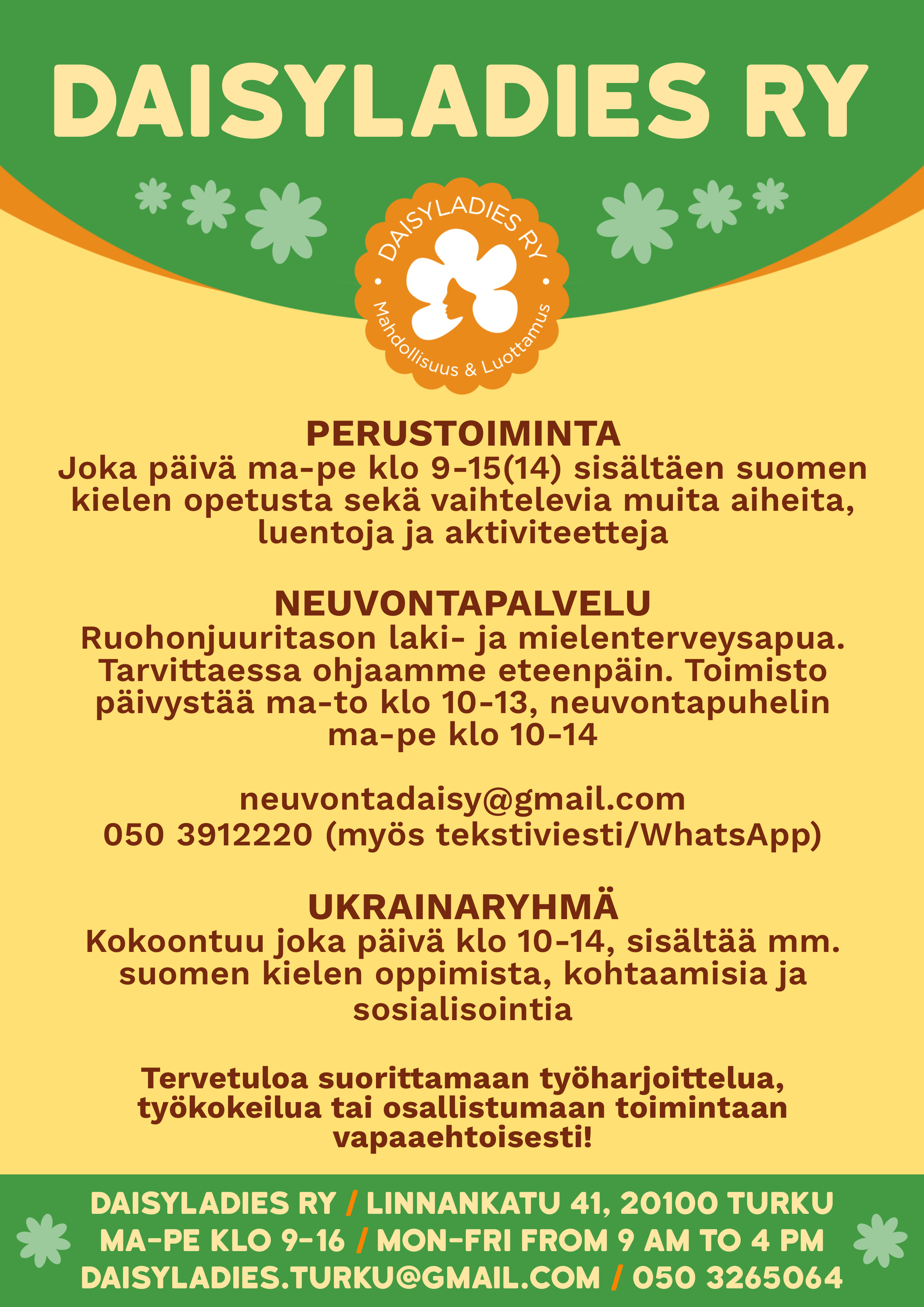 Lisätiedot ja tiedustelut: puh. 050 326 5064 tai daisyladies.turku@gmail.com